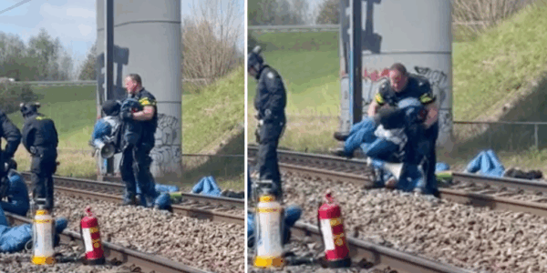 Klimaatactivisten schreeuwen als ze beseffen dat hun handen daadwerkelijk vastzitten op de rails in Rotterdam
