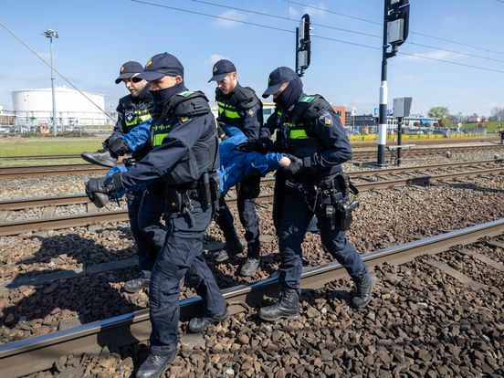 Ze ketenden zich vast met buizen en sloten de lijn volledig af. De politie was er snel bij, maar het optreden verliep dit keer opvallend hardhandig.