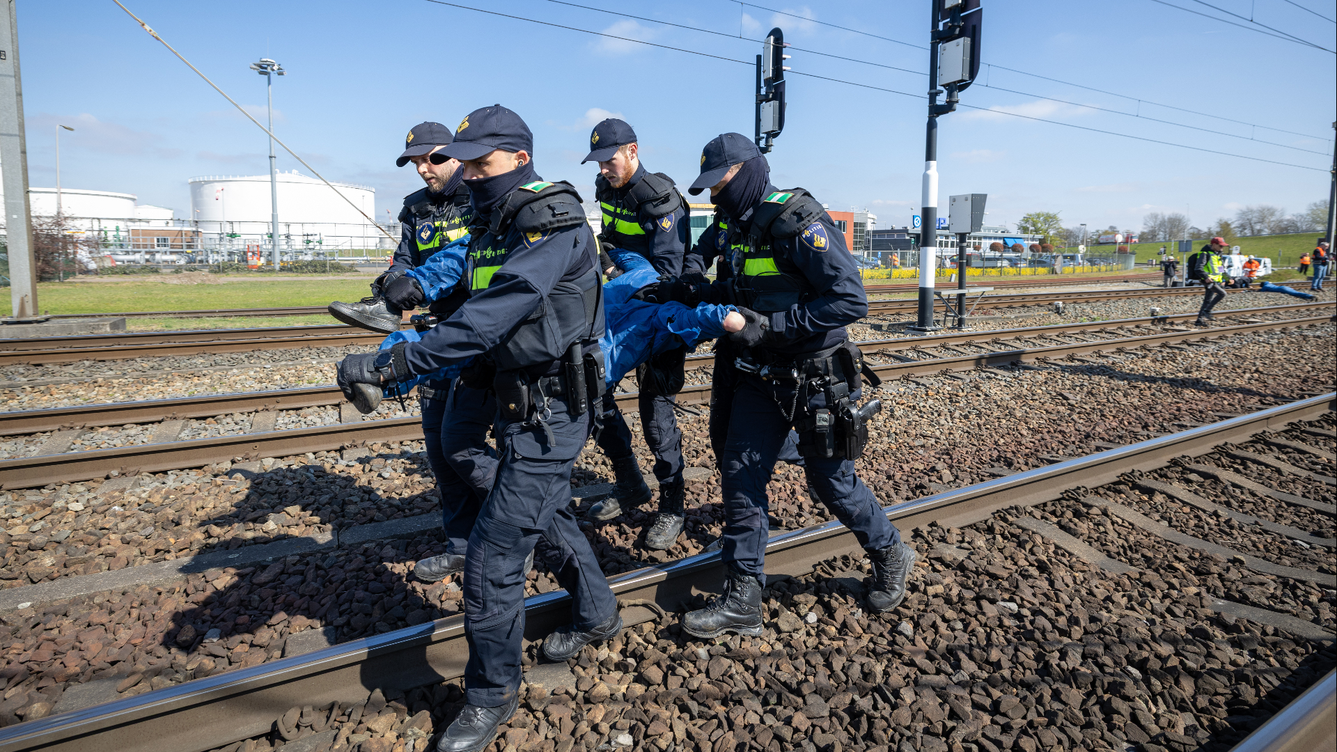 Ze ketenden zich vast met buizen en sloten de lijn volledig af. De politie was er snel bij, maar het optreden verliep dit keer opvallend hardhandig.