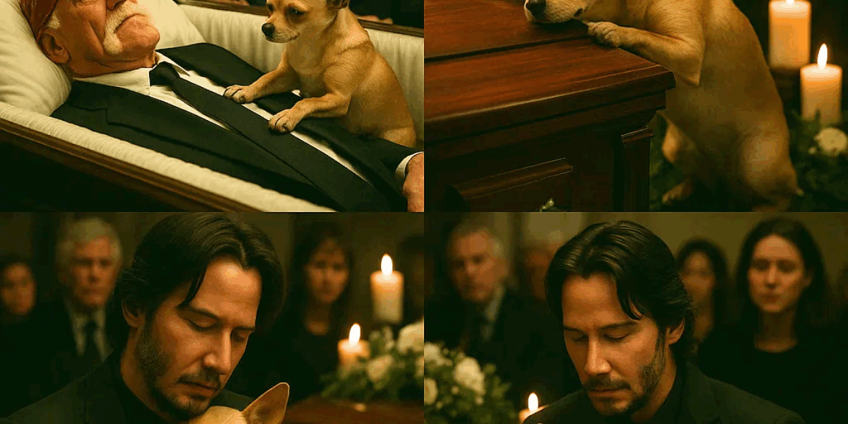 In that instant, everything else around Keanu seemed to disappear. No more candlelight. No more watching eyes. Just him and a small creature enduring a kind of pain words could never express. Duke didn’t cry like humans do. But in the way his little body trembled at the sound of each footstep, in how he gently rested his head against the casket — as if trying to feel one last trace of warmth — Keanu felt a blade twist quietly in his chest.